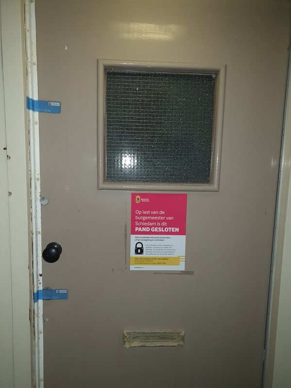 Foto: het gesloten pand aan de Vlaardingerdijk (bron foto Twitter, Toezicht & Handhaving Schiedam, @THHSchiedam)
