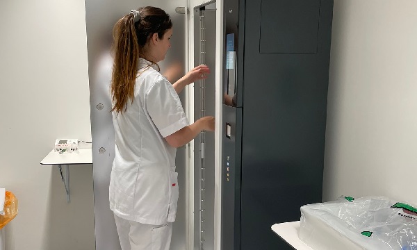 Foto: gespecialiseerd doktersassistent Rowie Steenhorst plaatst scope in UV-C licht desinfector