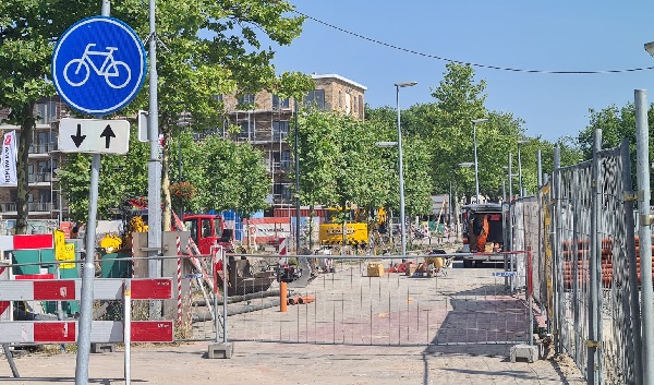 Kom je als fietser van de andere kant aan op de Parkweg ter hoogte van de Van Haarenlaan (zie foto onder), dan zie je weliswaar het bord dat de weg dicht is, maar hier kun je wél doorfietsen op het tijdelijke fietspad dat er nog ligt om je dan uiteindelijk toch vast te rijden in de afzetting ter hoogte van de Nolenslaan. Er zit dan niets anders op dan om te keren. En inderdaad, je had het kunnen weten: er staat toch een bord dat de weg verboden is om in te rijden voor alle verkeer uitgezonderd bouwverkeer. Dat fietspad was echter wél toegankelijk. Duidelijk vinden wij het in ieder geval niet aangegeven voor de fietsers.
