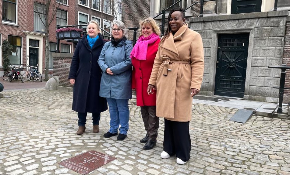 Op de foto boven het artikel van links naar rechts na de onthulling wethouder Antoinette Laan, initiatiefneemster Saskia Beukman, wethouders Petra Zwang en Anouschka Biekman.